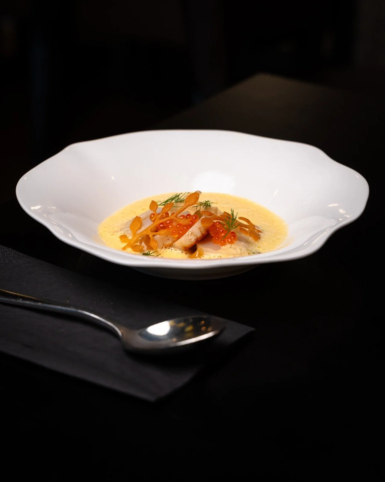 Kremet skalldyrsuppe med sjøkreps, krepsehaler, syltet gulrot og fennikelmarmelade. (H, M, SO, SV)