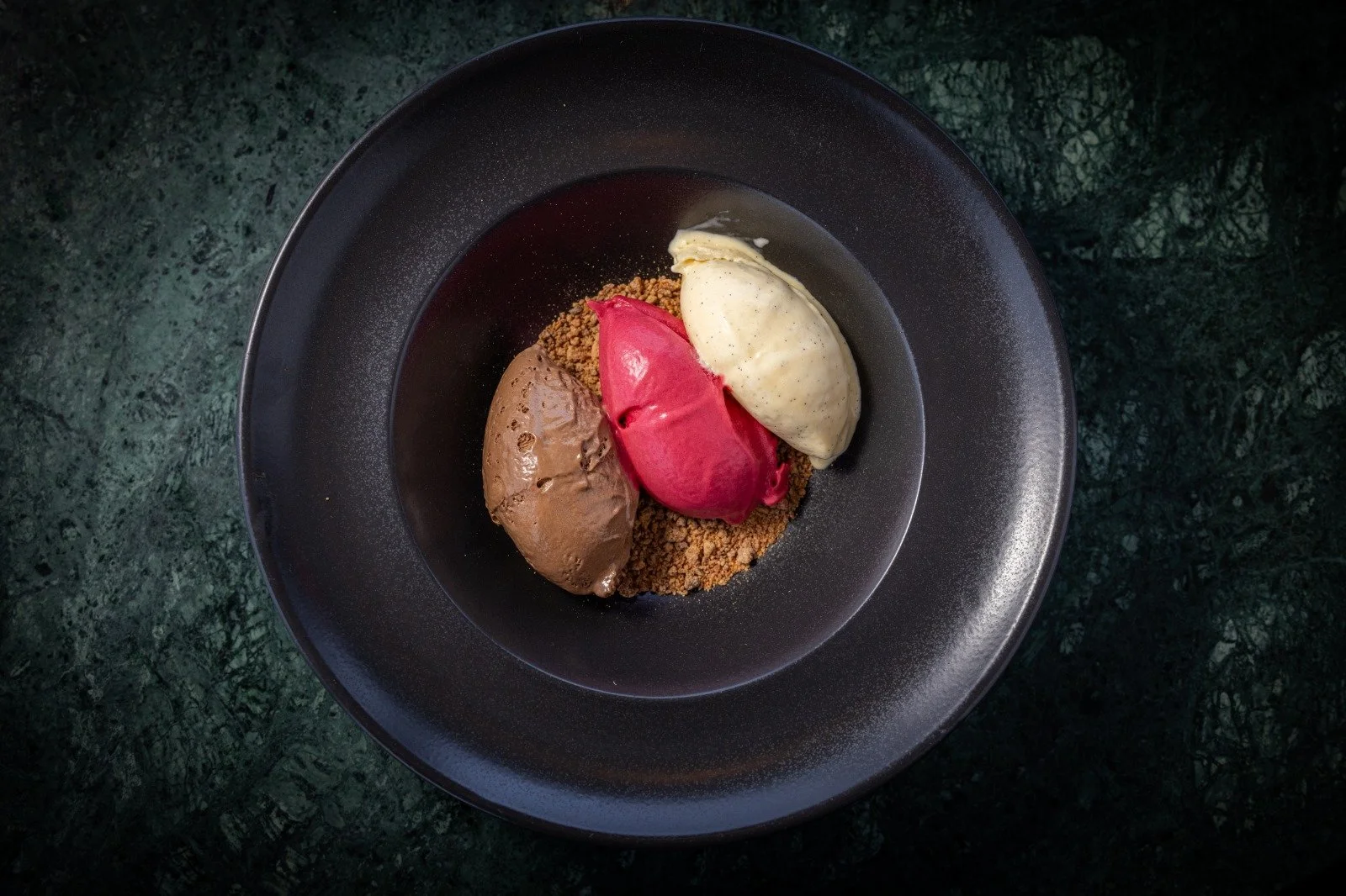 Husets is Grand Cru Vaniljeis, bringebæris, sjokoladeis